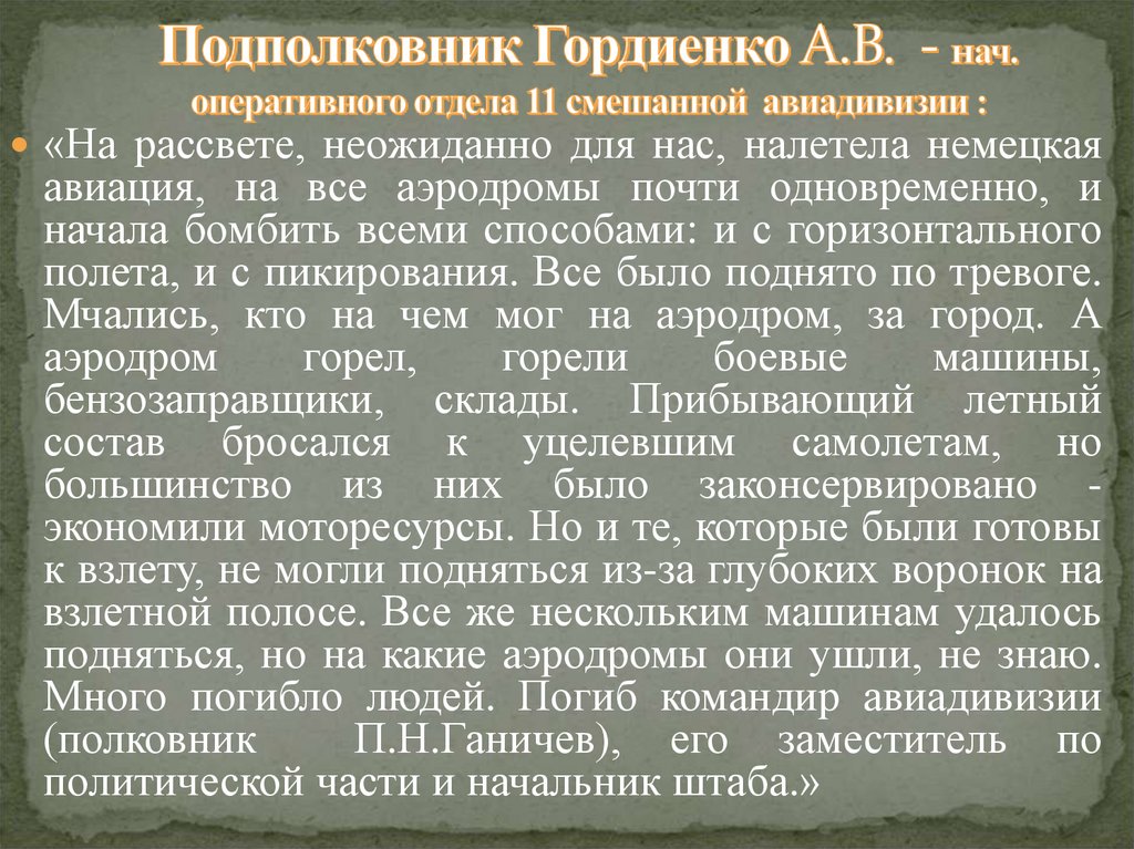 «На рассвете, неожиданно для нас, налетела немецкаяавиация, на все аэродромы почти одновременно, и