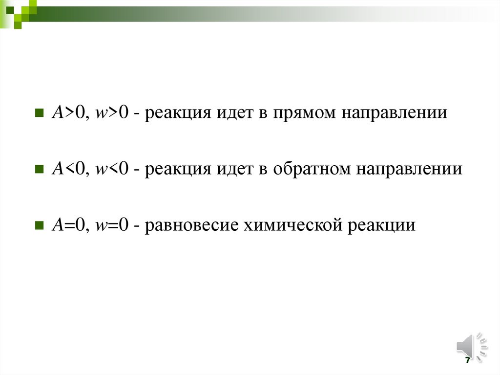 A>0, w>0 - реакция идет в прямом направленииA<0, w<0 - реакция идет в обратном направлении