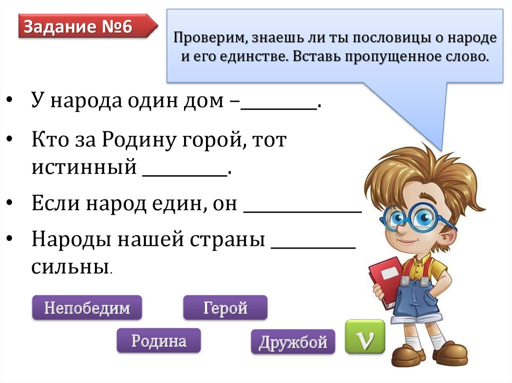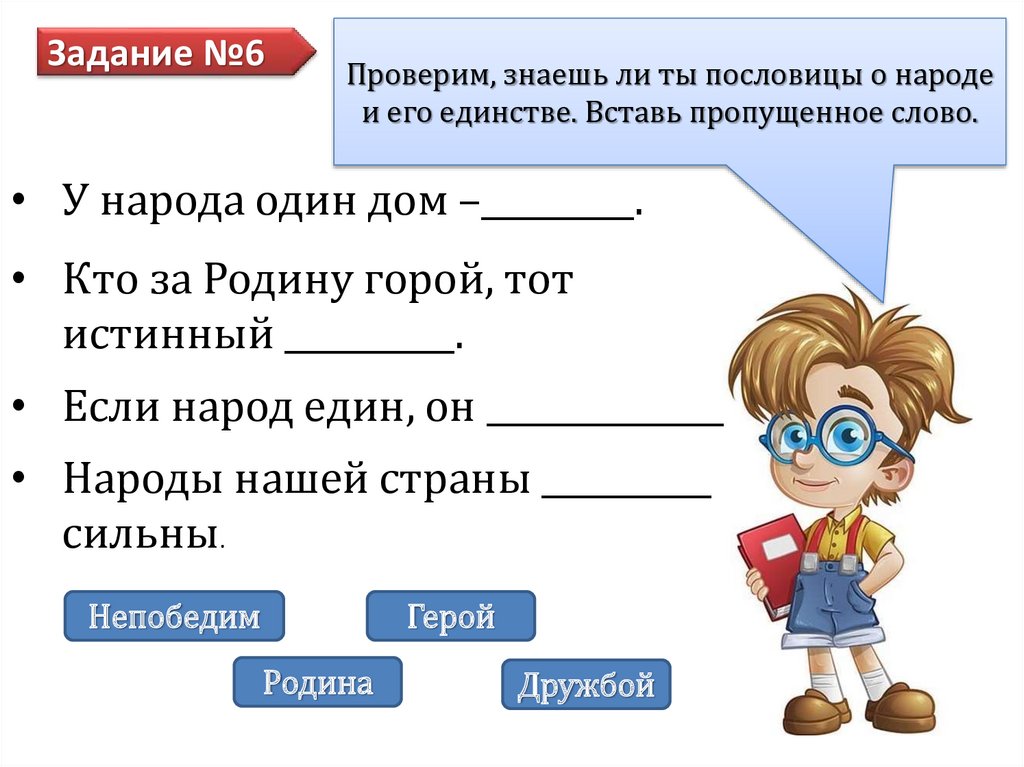 Задание №6Проверим, знаешь ли ты пословицы о народе