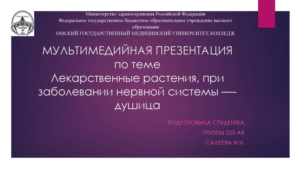 1. МУЛЬТИМЕДИЙНАЯ ПРЕЗЕНТАЦИЯ по теме Лекарственные растения, при заболевании нервной системы —- душица
