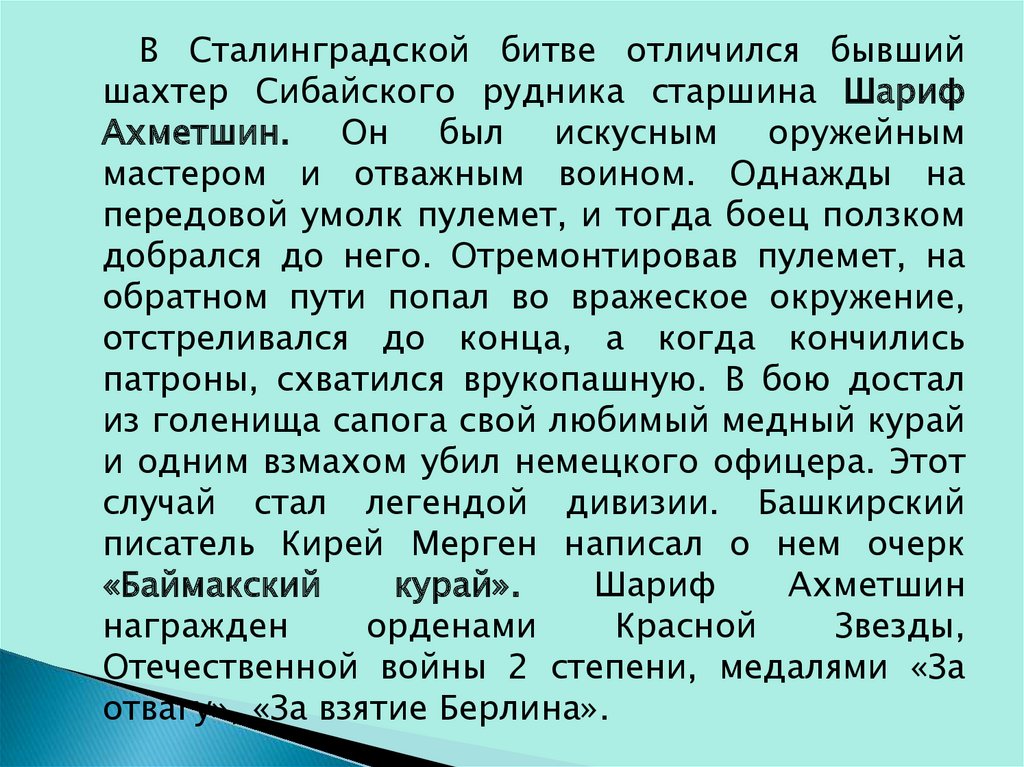 В Сталинградской битве отличился бывшийшахтер Сибайского рудника старшина Шариф