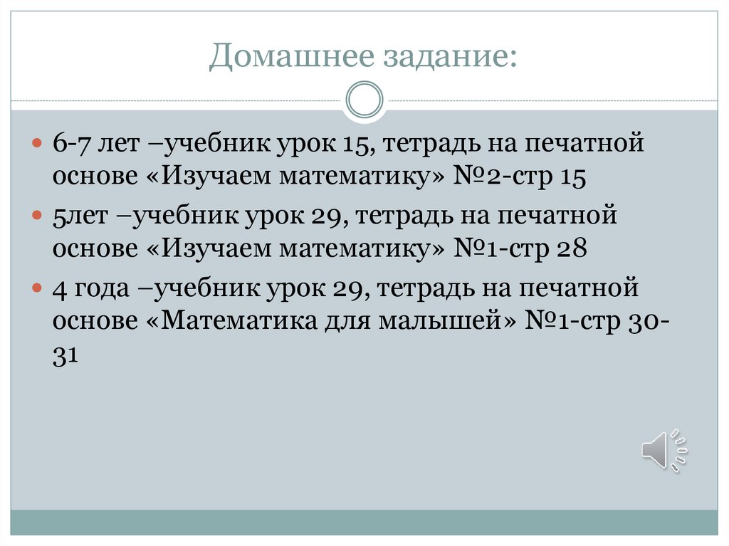 Домашнее задание:6-7 лет –учебник урок 15, тетрадь на печатной