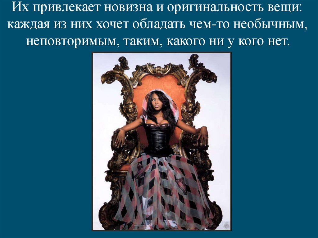 Их привлекает новизна и оригинальность вещи:каждая из них хочет обладать чем-то необычным,