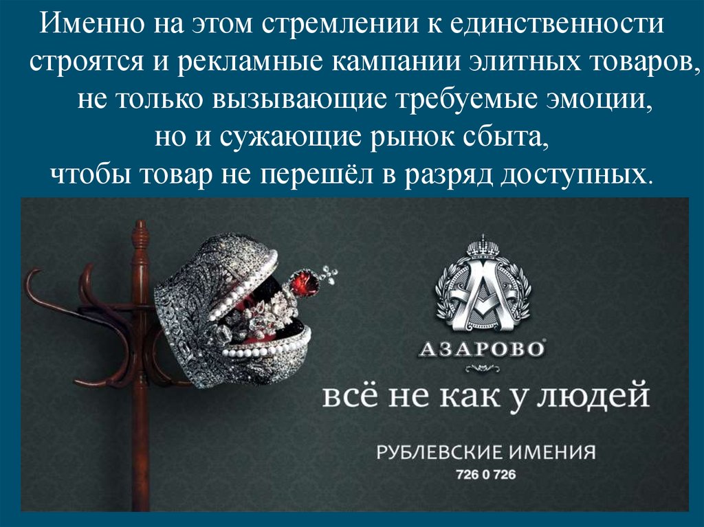 Именно на этом стремлении к единственностистроятся и рекламные кампании элитных товаров,
