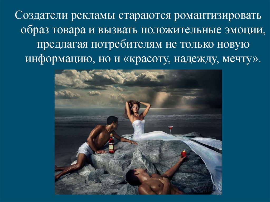 Создатели рекламы стараются романтизироватьобраз товара и вызвать положительные эмоции,