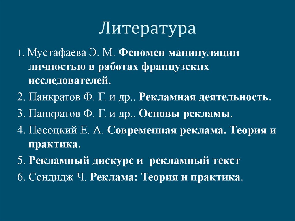 Литература1. Мустафаева Э. М. Феномен манипуляции