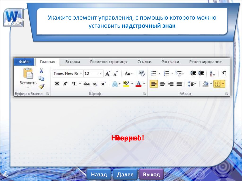 Укажите элемент управления, с помощью которого можноустановить надстрочный знак