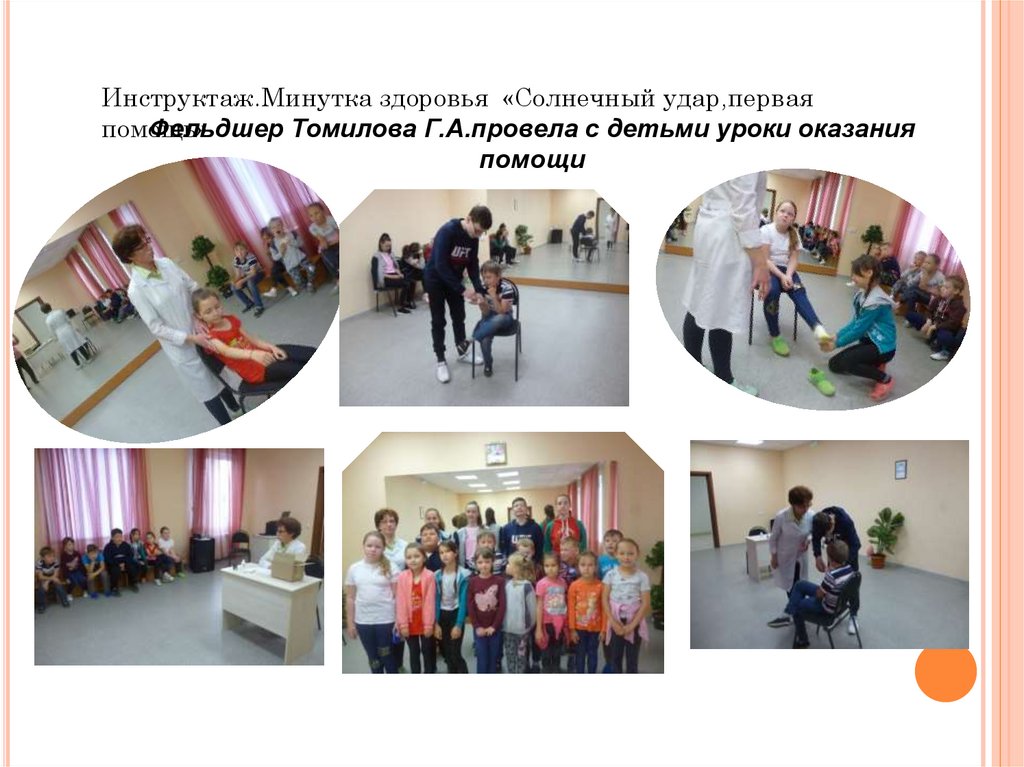 Инструктаж.Минутка здоровья «Солнечный удар,перваяФельдшер Томилова Г.А.провела с детьми уроки оказания