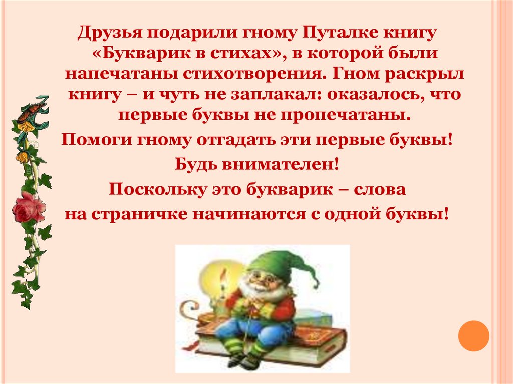 Друзья подарили гному Путалке книгу«Букварик в стихах», в которой были