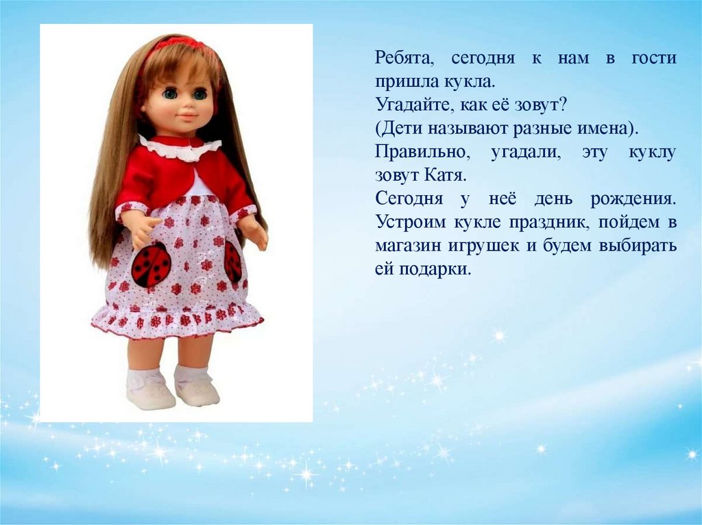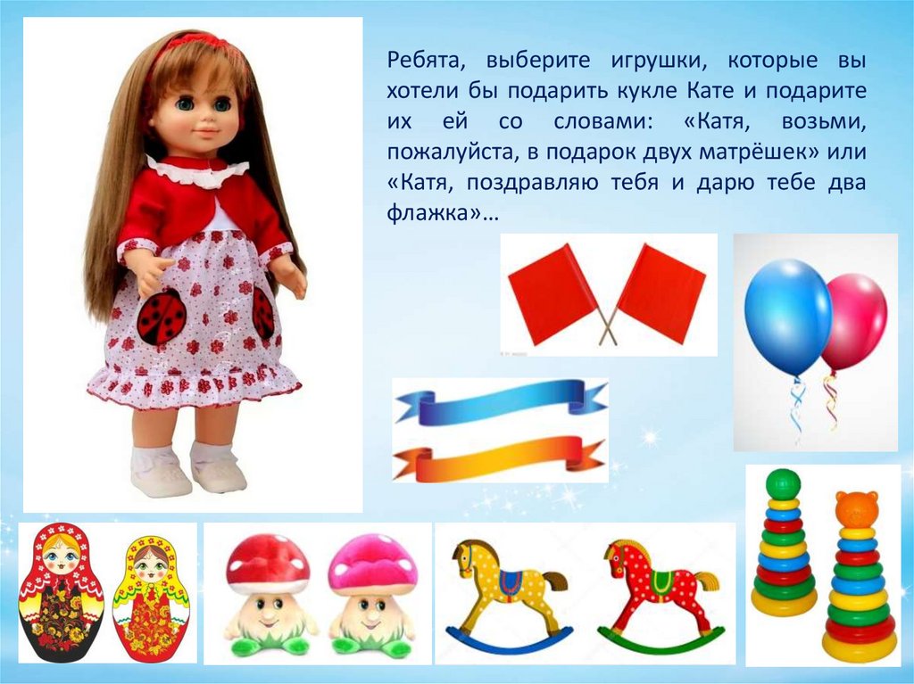 Ребята, выберите игрушки, которые выхотели бы подарить кукле Кате и подарите