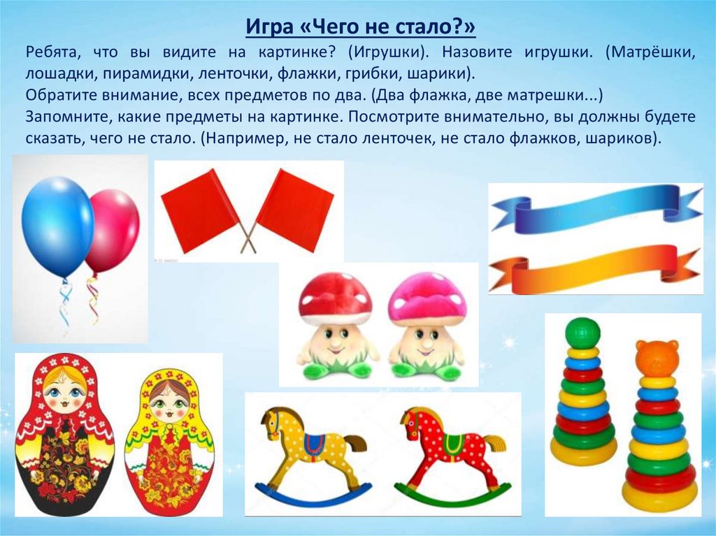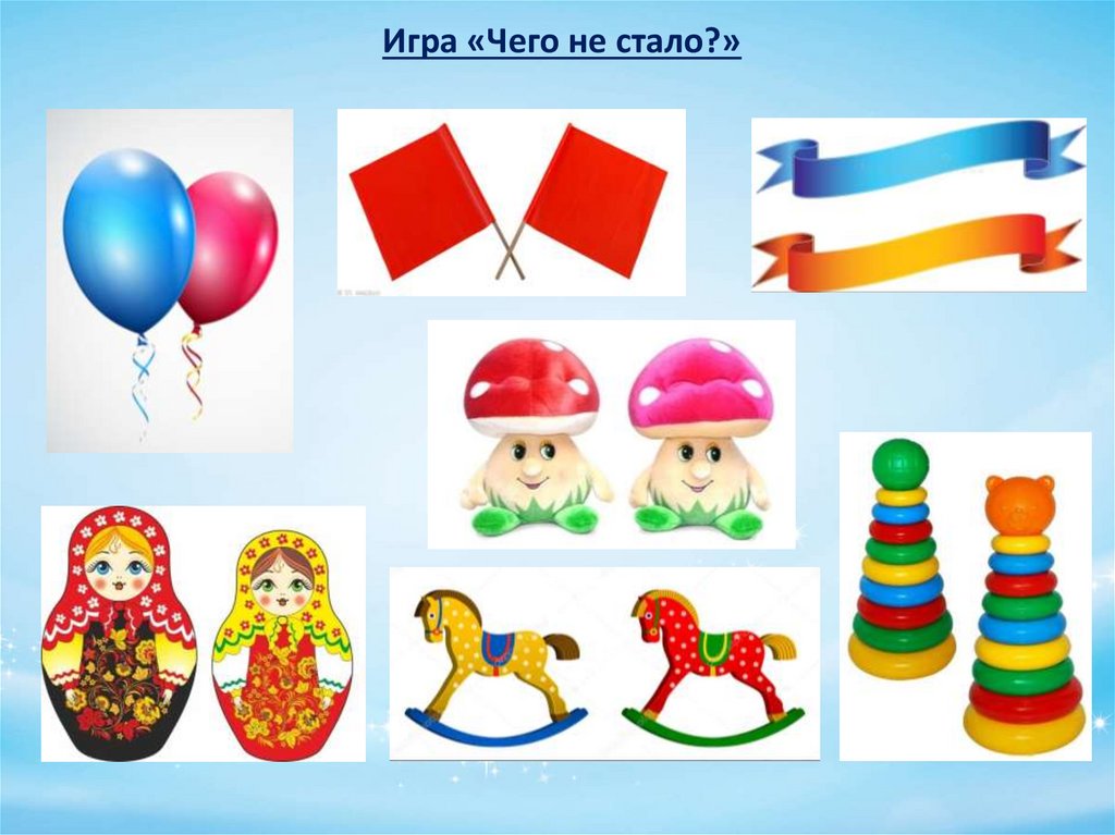 Игра «Чего не стало?»Ребята, что вы видите на картинке? (Игрушки). Назовите игрушки. (Матрёшки,