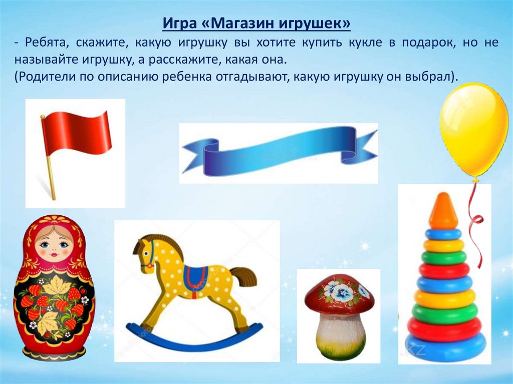 (Родители по описанию ребенка отгадывают, какую игрушку он выбрал).