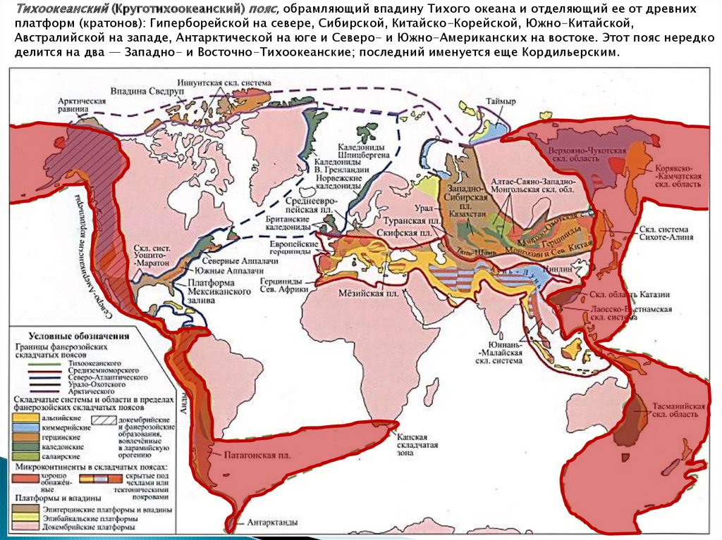 Тихоокеанский (Круготихоокеанский) пояс, обрамляющий впадину Тихого океана и отделяющий ее от древнихплатформ (кратонов): Гиперборейской на севере, Сибирской, Китайско-Корейской, Южно-Китайской,