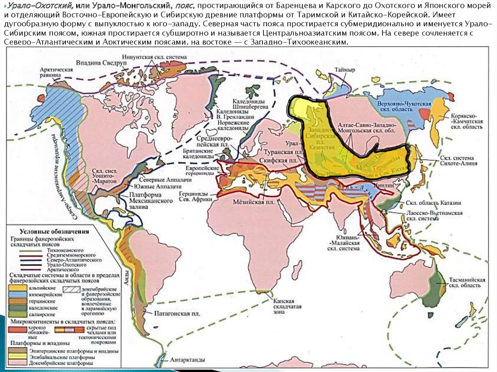 дугообразную форму с выпуклостью к юго-западу. Северная часть пояса простирается субмеридионально и именуется УралоСибирским поясом, южная простирается субширотно и называется Центральноазиатским поясом. На севере сочленяется с
