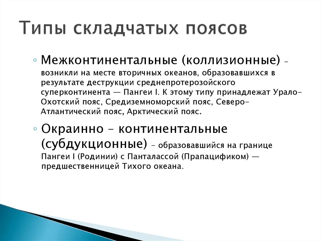 суперконтинента — Пангеи I. К этому типу принадлежат УралоОхотский пояс, Средиземноморский пояс, СевероАтлантический пояс, Арктический пояс.