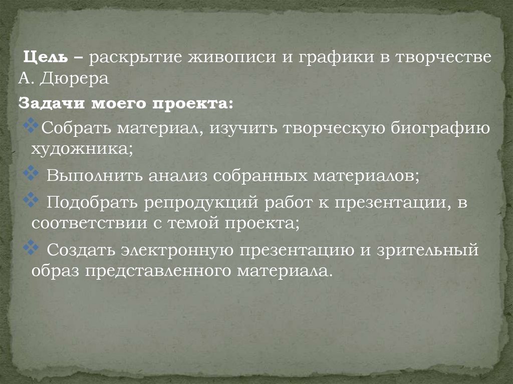 Цель – раскрытие живописи и графики в творчествеА. Дюрера