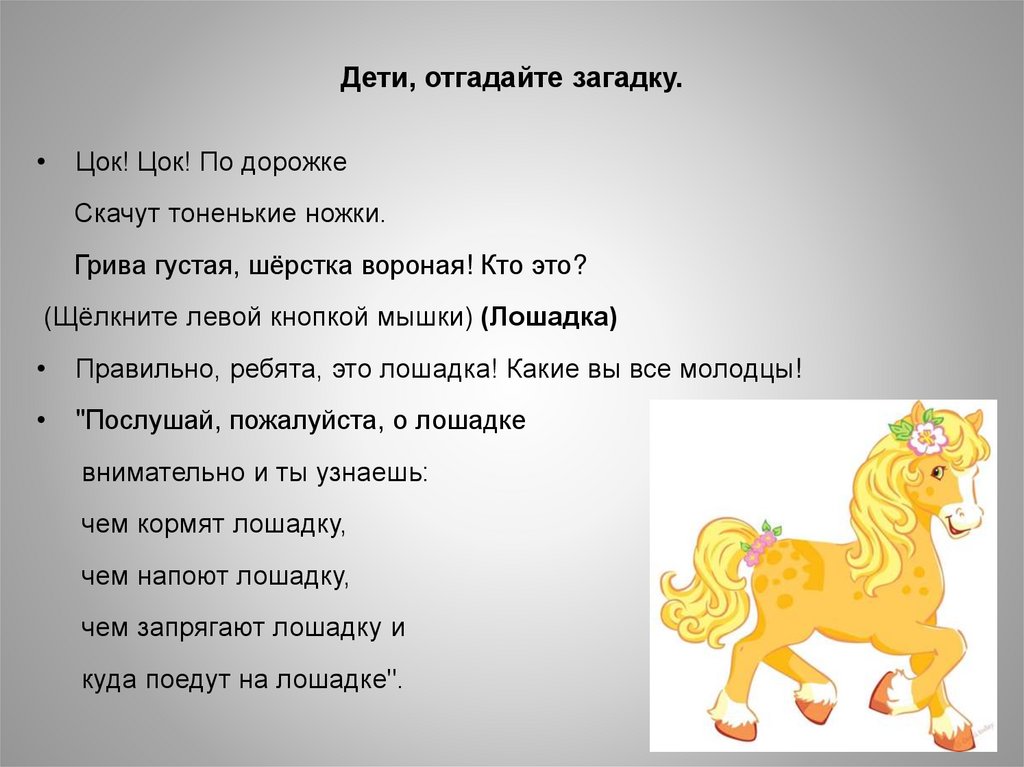 Правильно, ребята, это лошадка! Какие вы все молодцы!
