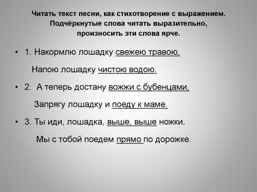 Читать текст песни, как стихотворение с выражением.Подчёркнутые слова читать выразительно,