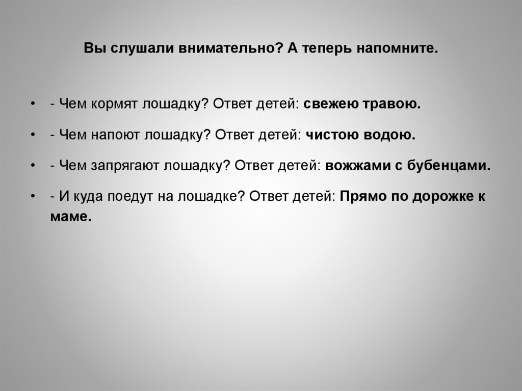 Вы слушали внимательно? А теперь напомните.• - Чем кормят лошадку? Ответ детей: свежею травою.