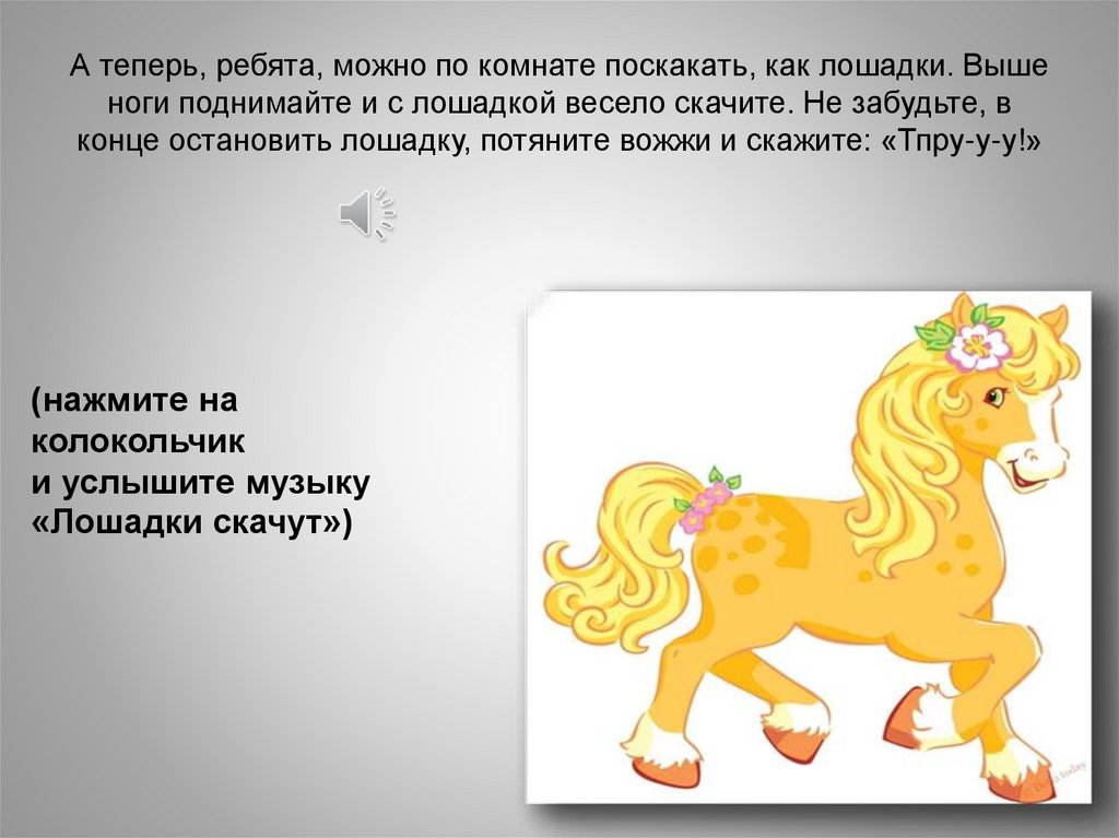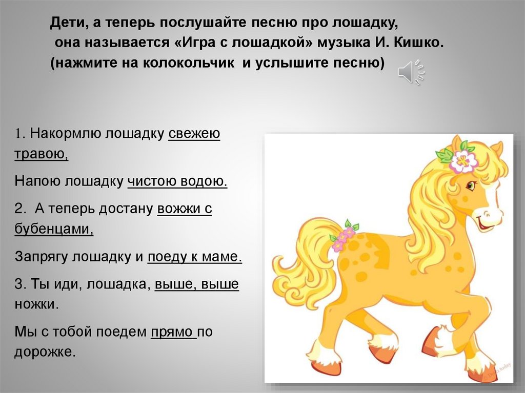 Дети, а теперь послушайте песню про лошадку,она называется «Игра с лошадкой» музыка И. Кишко.
