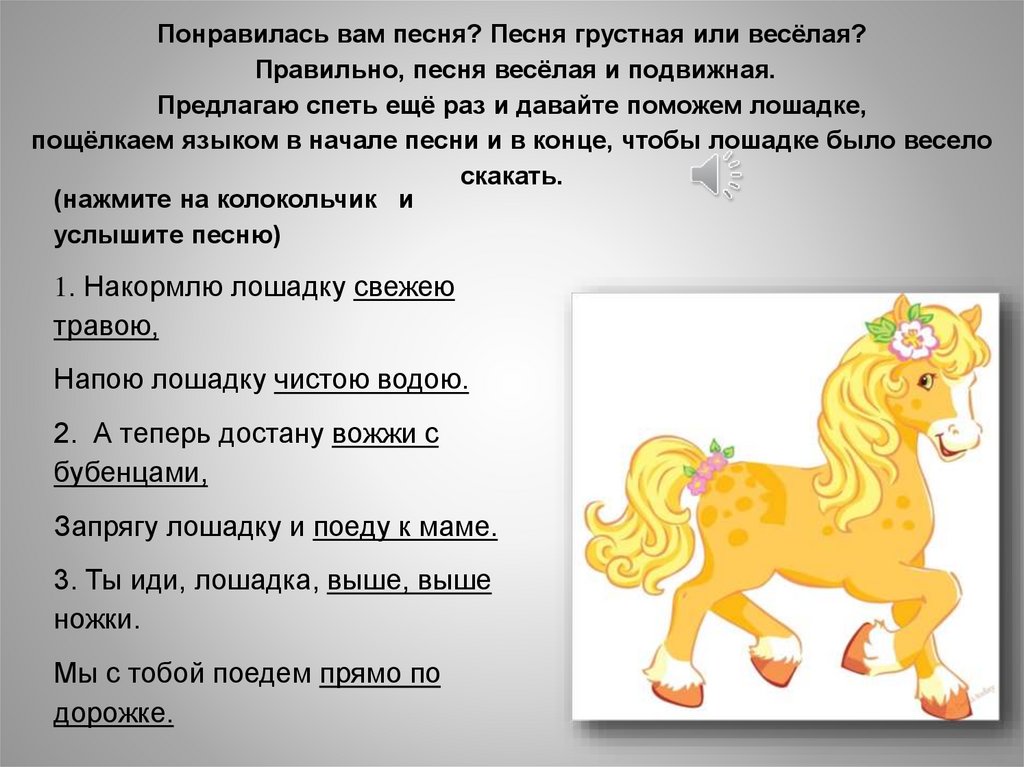 пощёлкаем языком в начале песни и в конце, чтобы лошадке было весело