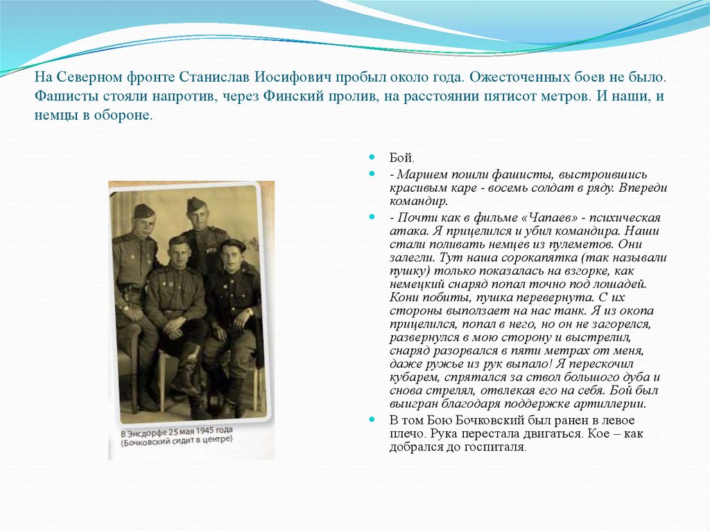 На Северном фронте Станислав Иосифович пробыл около года. Ожесточенных боев не было.Фашисты стояли напротив, через Финский пролив, на расстоянии пятисот метров. И наши, и