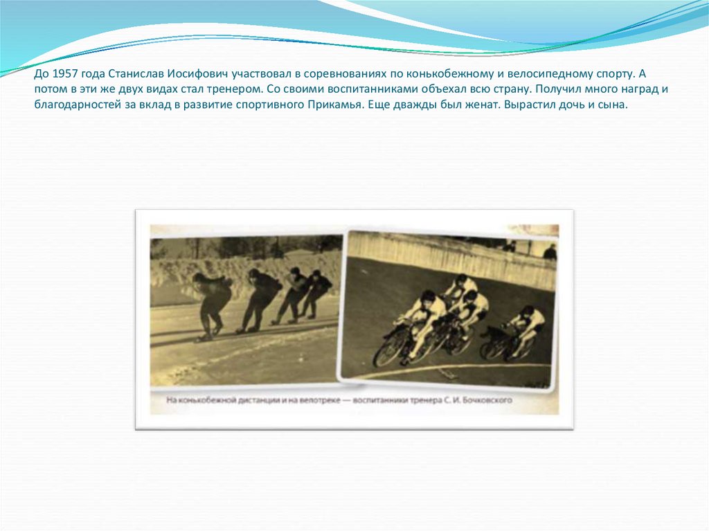 До 1957 года Станислав Иосифович участвовал в соревнованиях по конькобежному и велосипедному спорту. Апотом в эти же двух видах стал тренером. Со своими воспитанниками объехал всю страну. Получил много наград и