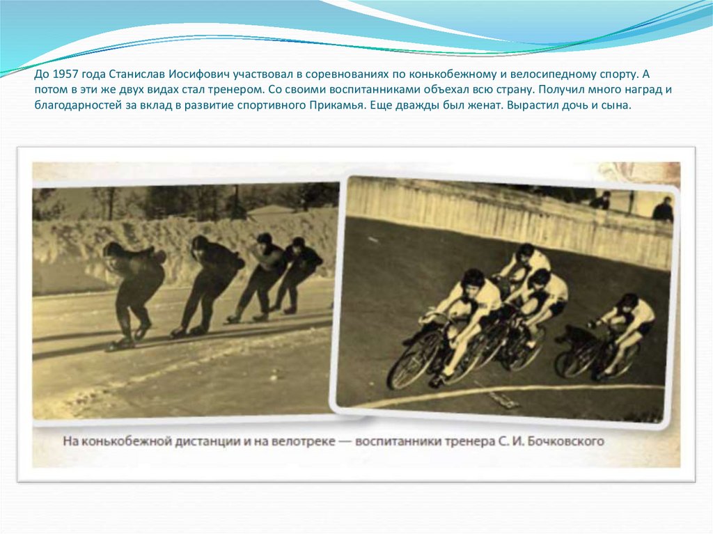 До 1957 года Станислав Иосифович участвовал в соревнованиях по конькобежному и велосипедному спорту. А