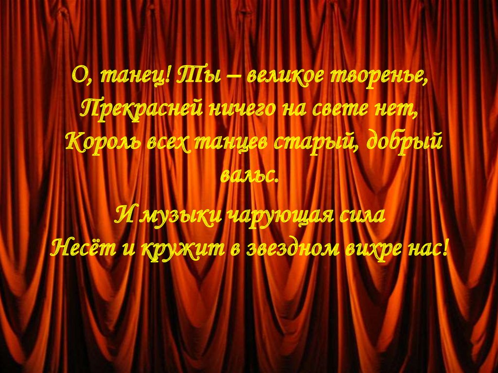 О, танец! Ты – великое творенье,Прекрасней ничего на свете нет,
