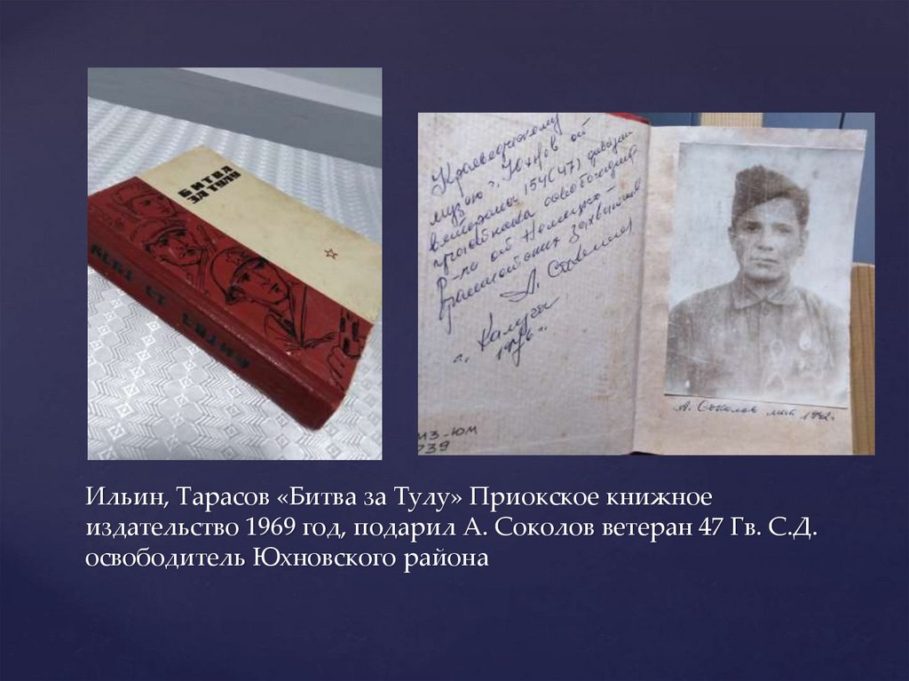 Ильин, Тарасов «Битва за Тулу» Приокское книжноеиздательство 1969 год, подарил А. Соколов ветеран 47 Гв. С.Д.