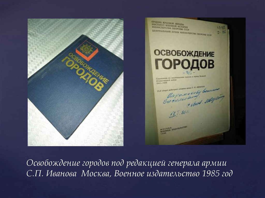 Освобождение городов под редакцией генерала армииС.П. Иванова Москва, Военное издательство 1985 год