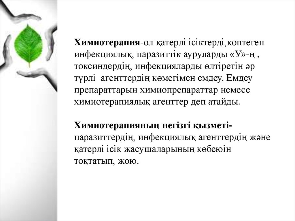 Химиотерапия-ол қатерлі ісіктерді,көптегенинфекциялық, паразиттік ауруларды «У»-ң ,