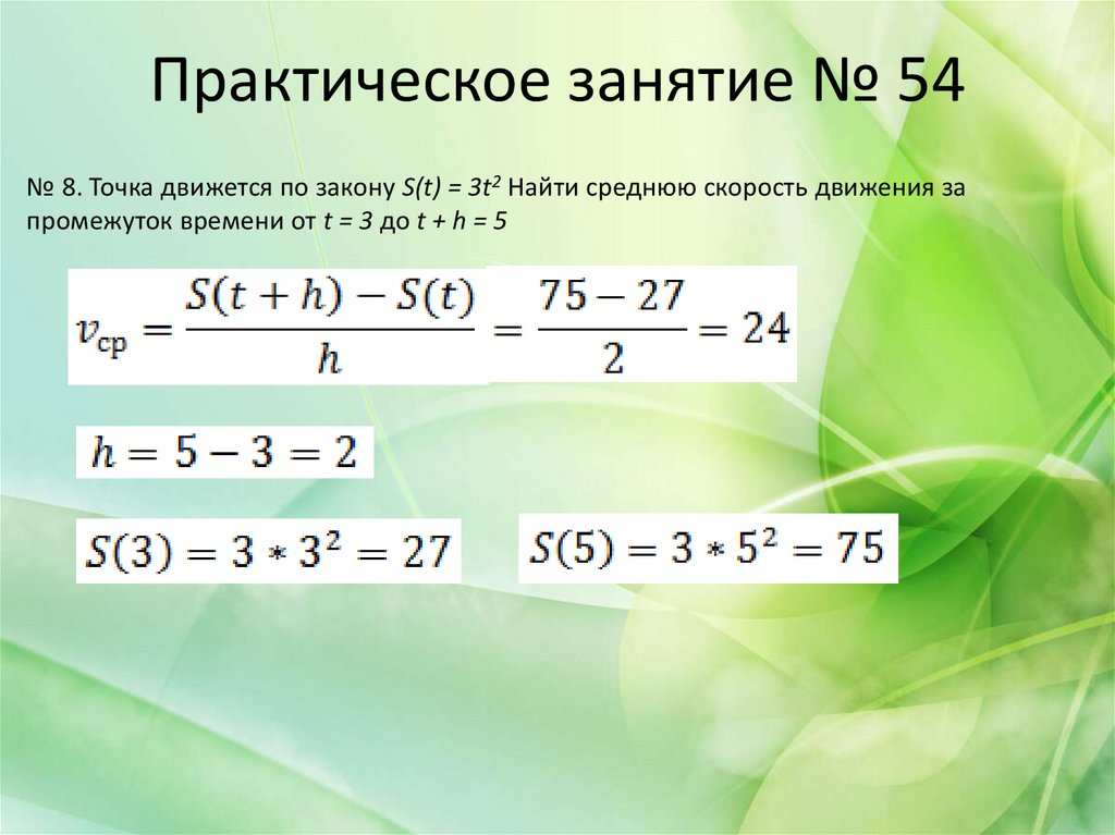 Практическое занятие № 54№ 8. Точка движется по закону S(t) = 3t2 Найти среднюю скорость движения за