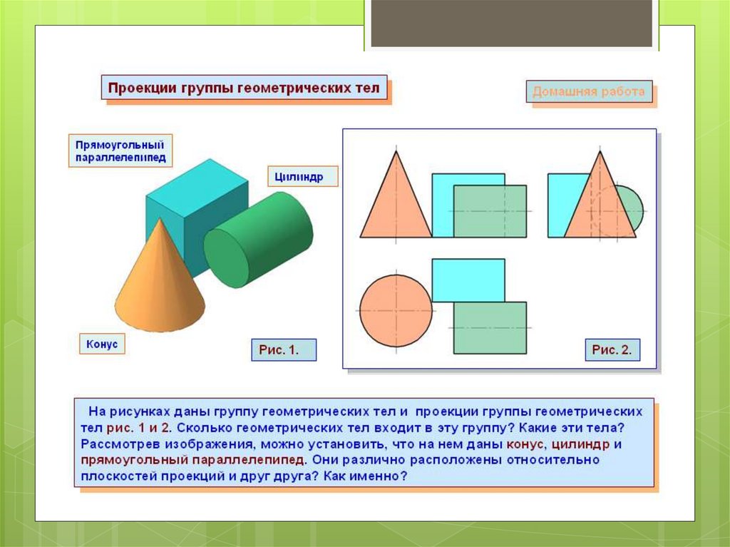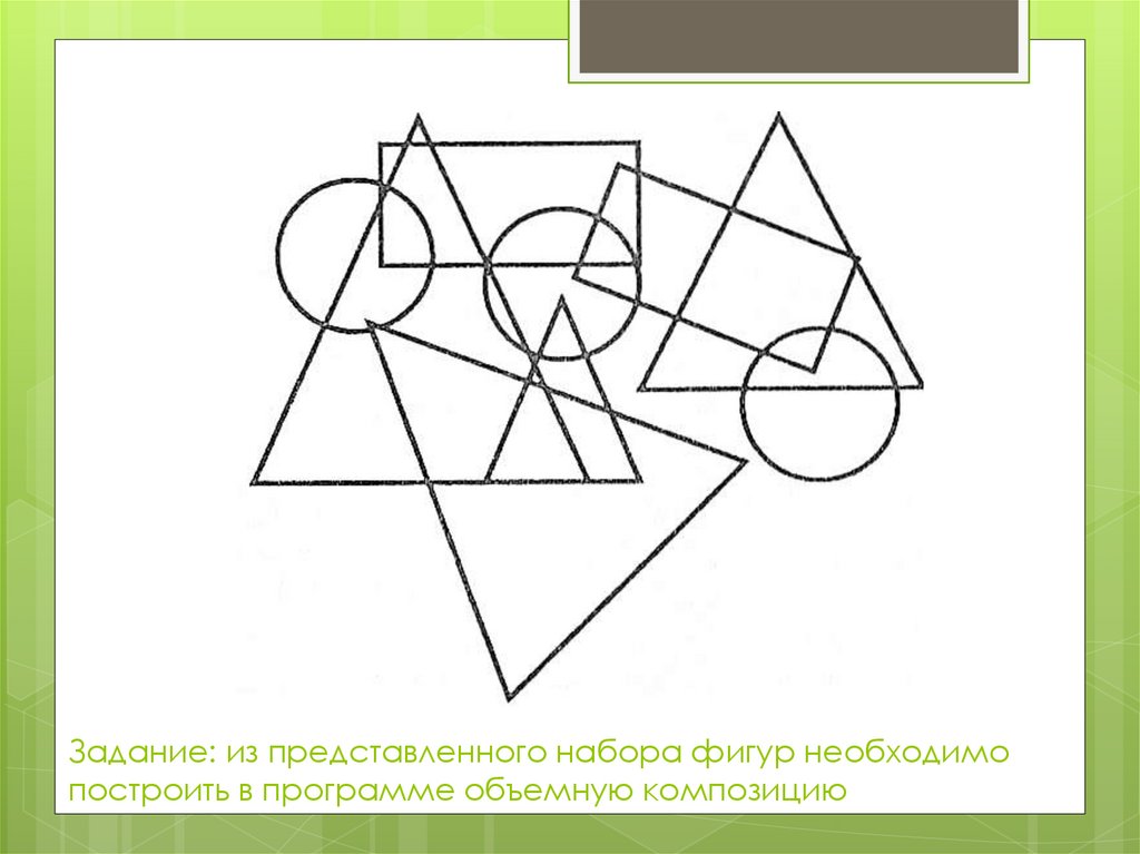 Задание: из представленного набора фигур необходимопостроить в программе объемную композицию