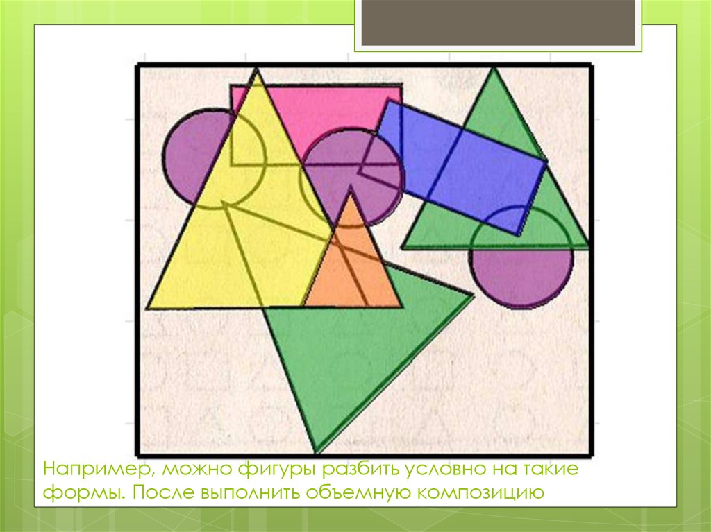 Например, можно фигуры разбить условно на такиеформы. После выполнить объемную композицию