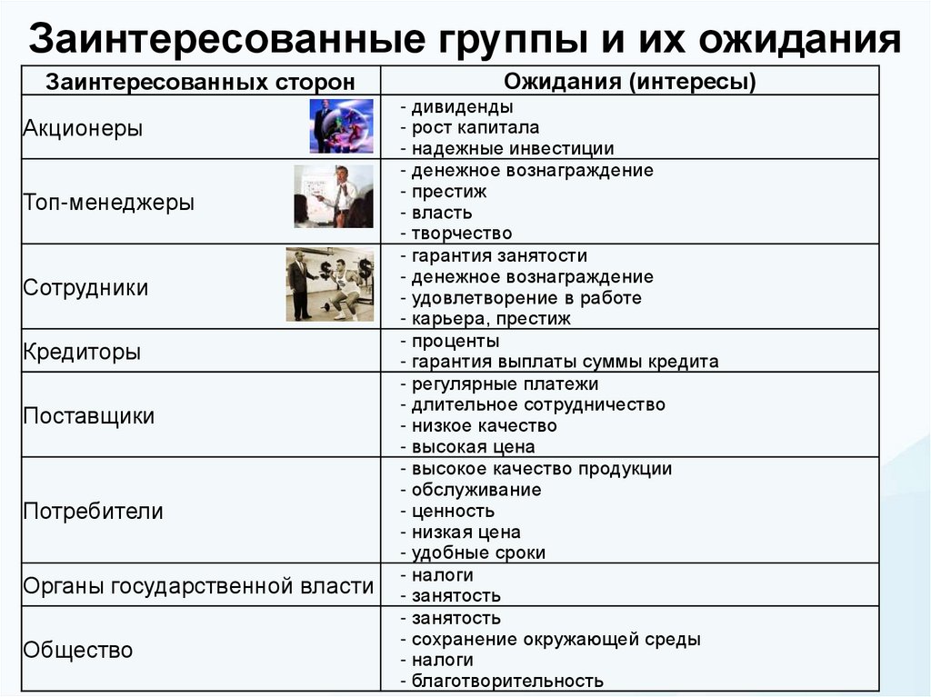 Заинтересованные группы и их ожиданияЗаинтересованных сторон