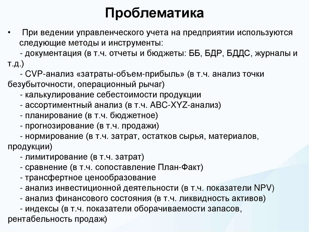 ПроблематикаПри ведении управленческого учета на предприятии используются
