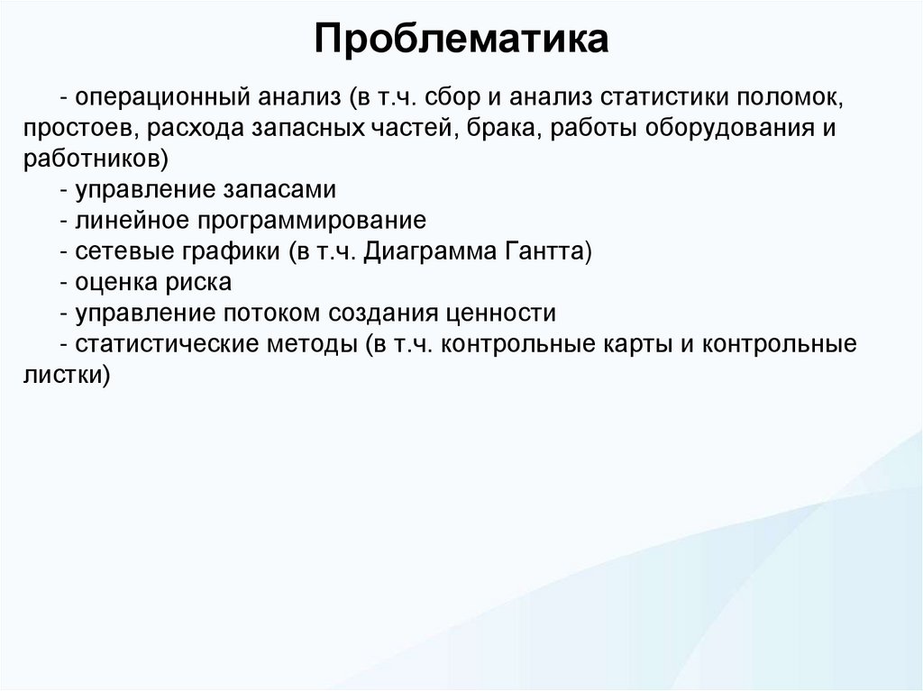 Проблематика- операционный анализ (в т.ч. сбор и анализ статистики поломок,
