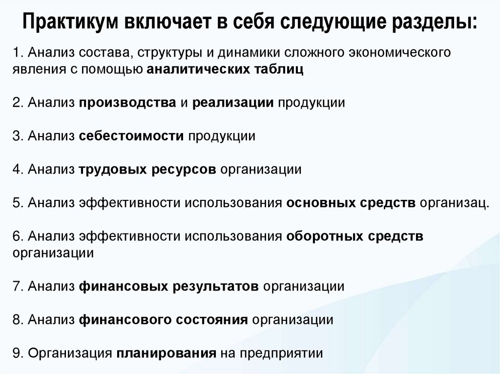 Практикум включает в себя следующие разделы:1. Анализ состава, структуры и динамики сложного экономического