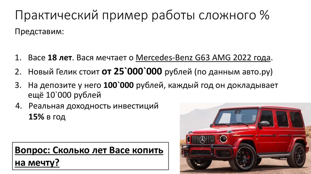 1. Васе 18 лет. Вася мечтает о Mercedes-Benz G63 AMG 2022 года.