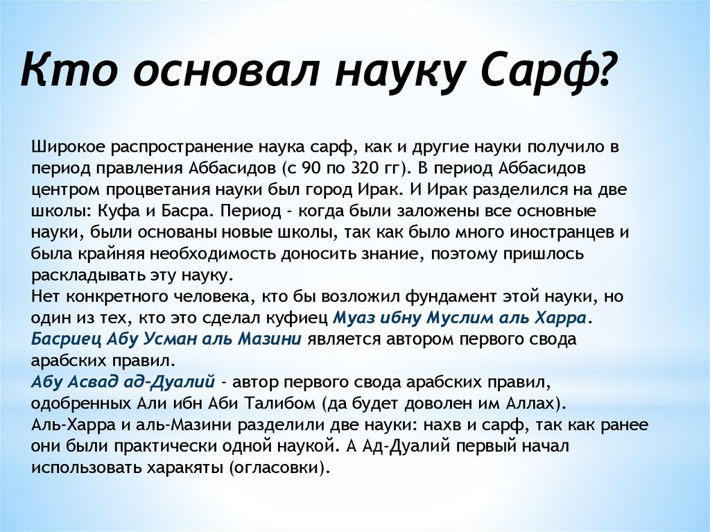 Кто основал науку Сарф?Широкое распространение наука сарф, как и другие науки получило в
