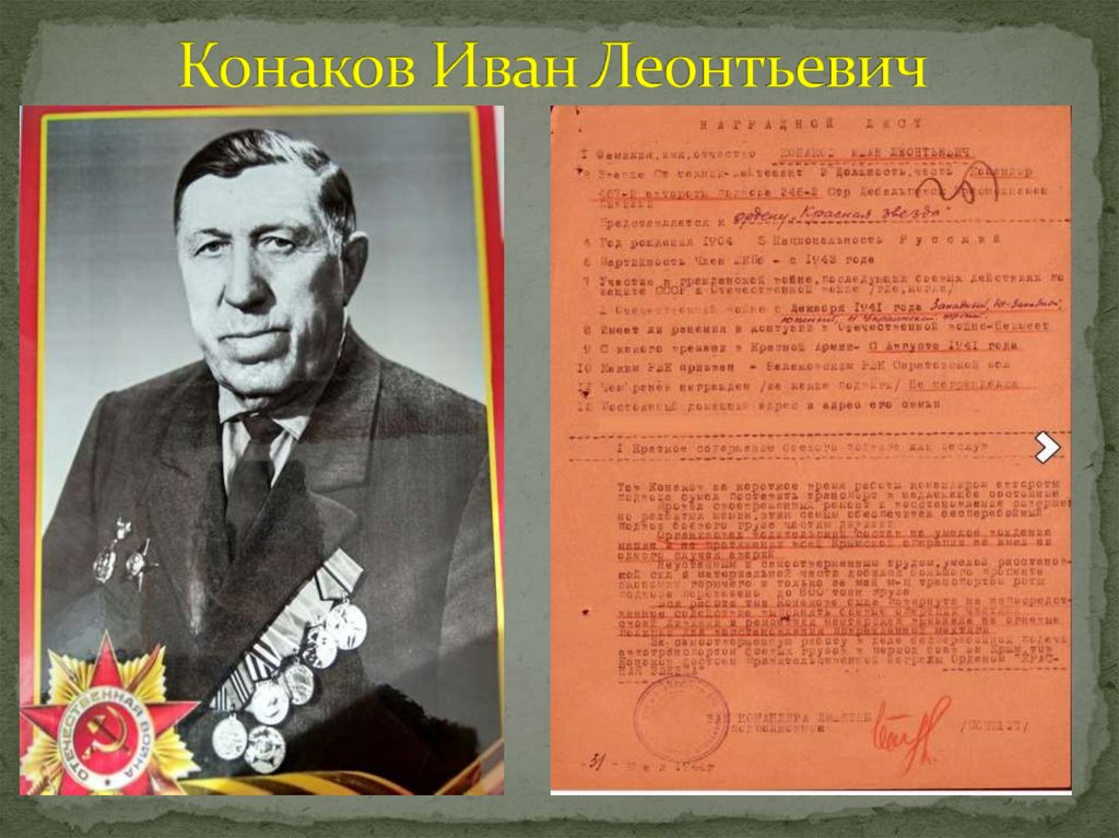 4. Прапрадедушка Конаков Иван Леонтьевич (1904 г.р.) Старший техник-лейтенант , командир автороты. Орден“Красной Звезды”, медаль “За победу над
