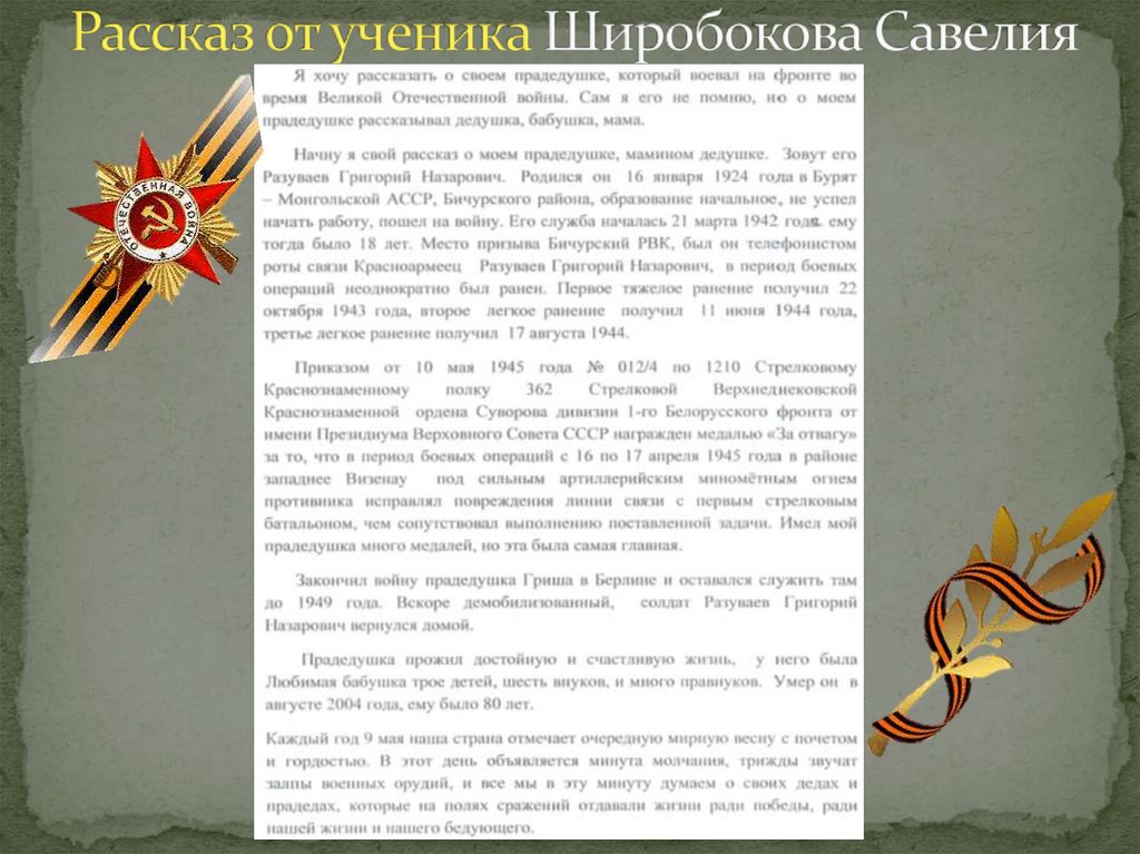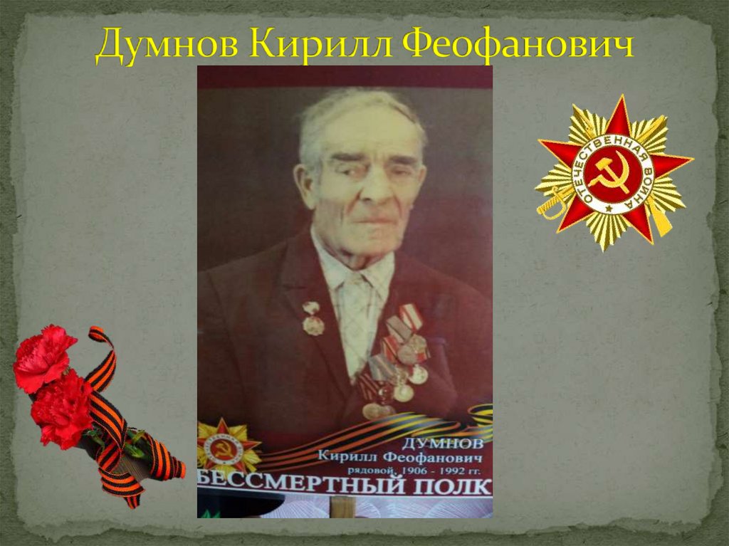 Рассказ от ученика Мельника АртёмаДумнов Кирилл Феофанович 11.06.1906-11.01.1992 ветеран ВОВ. Был призван в 1941