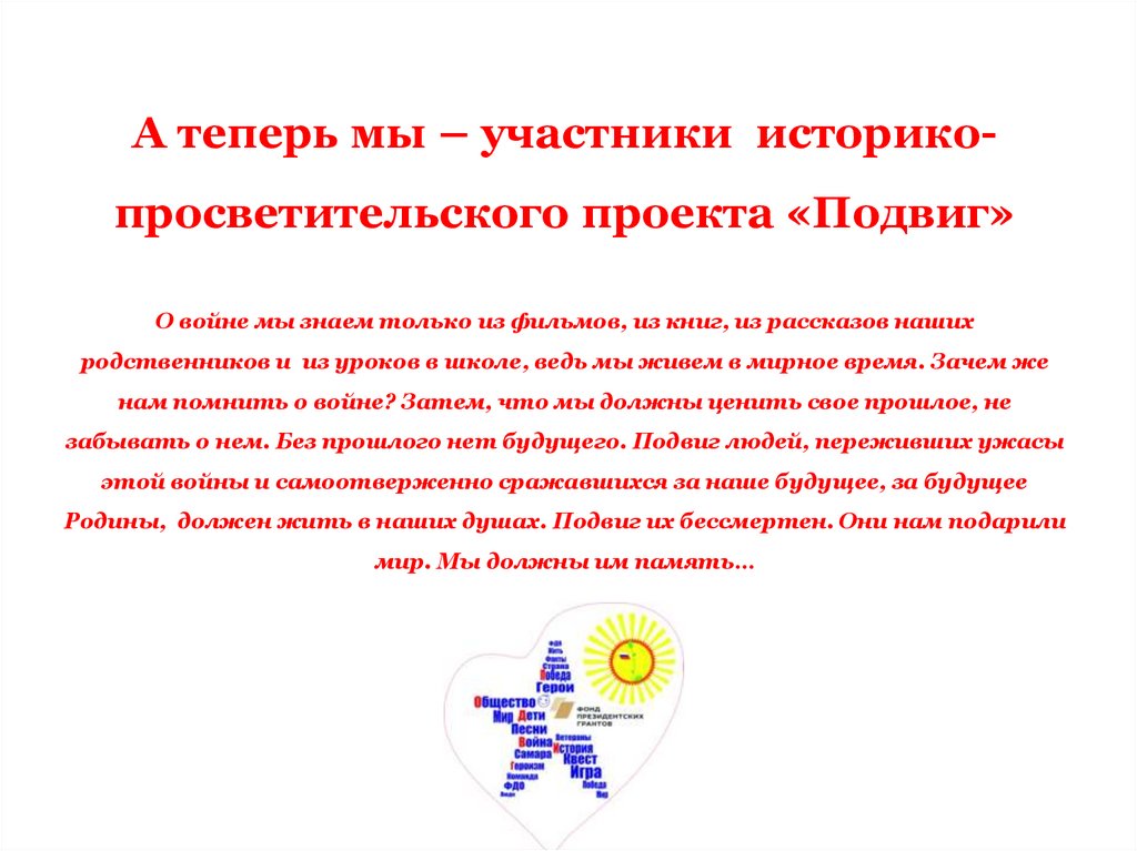 А теперь мы – участники историкопросветительского проекта «Подвиг»О войне мы знаем только из фильмов, из книг, из рассказов наших