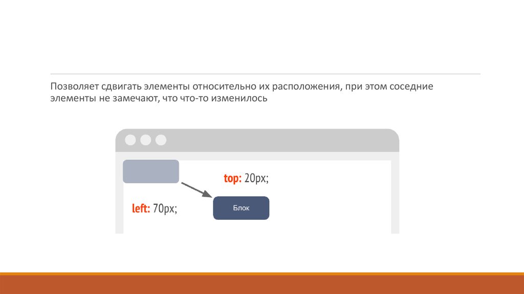 Позволяет сдвигать элементы относительно их расположения, при этом соседниеэлементы не замечают, что что-то изменилось