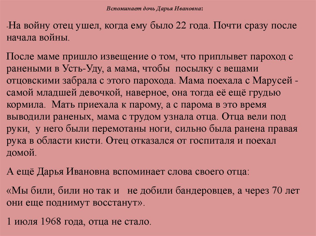 Вспоминает дочь Дарья Ивановна:На войну отец ушел, когда ему было 22 года. Почти сразу после