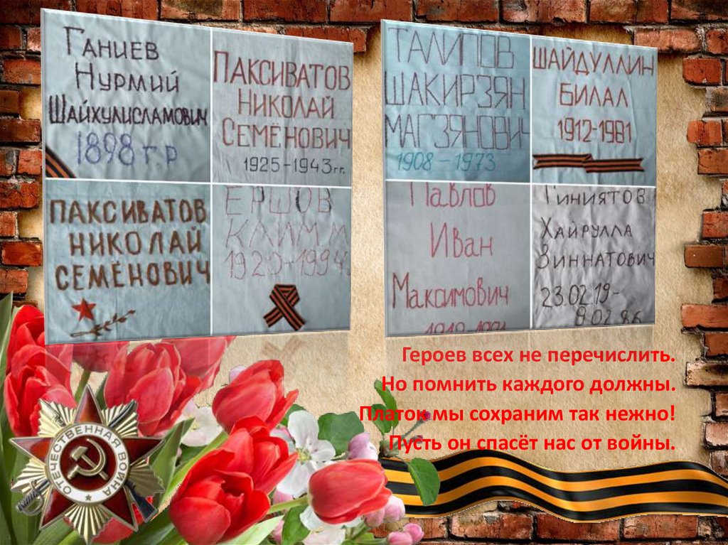 Героев всех не перечислить.Но помнить каждого должны.