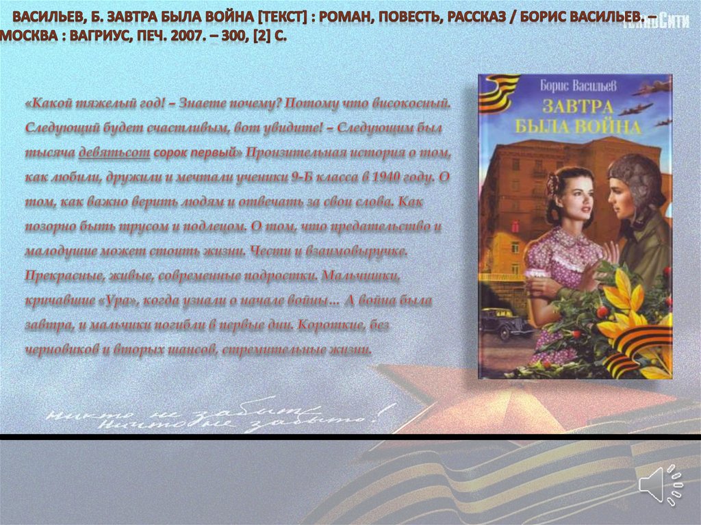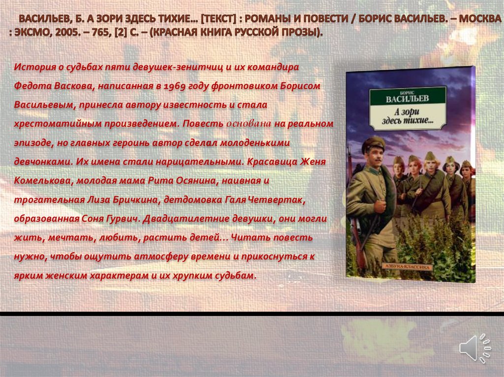 История о судьбах пяти девушек-зенитчиц и их командираФедота Васкова, написанная в 1969 году фронтовиком Борисом