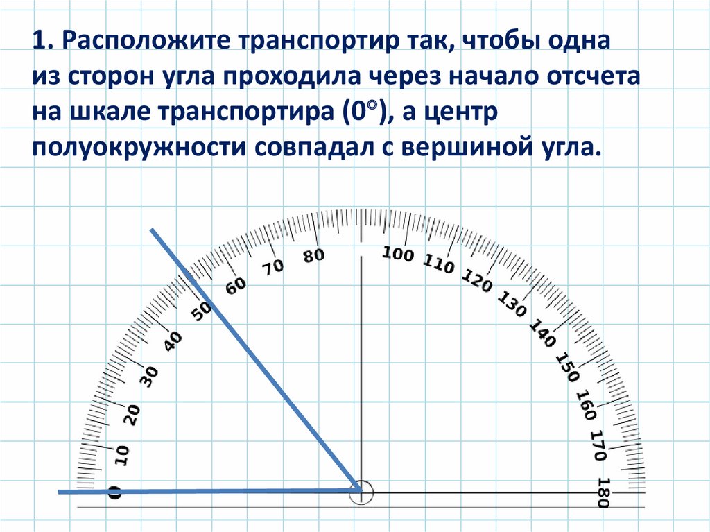 1. Расположите транспортир так, чтобы однаиз сторон угла проходила через начало отсчета