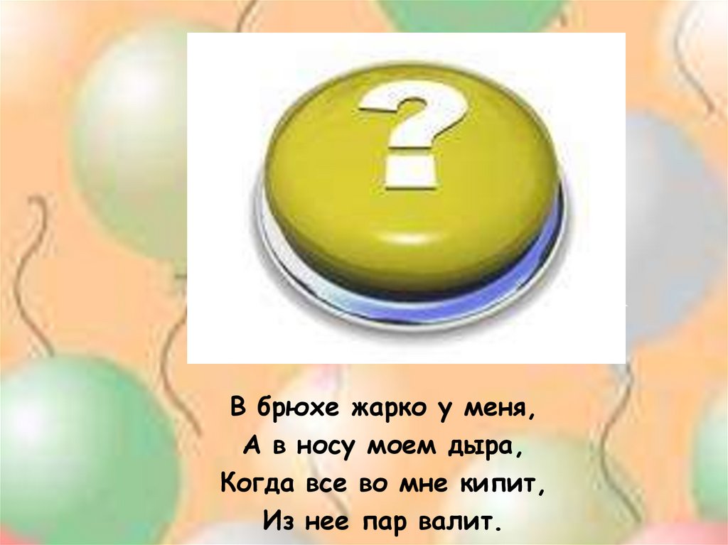 В брюхе жарко у меня,А в носу моем дыра,